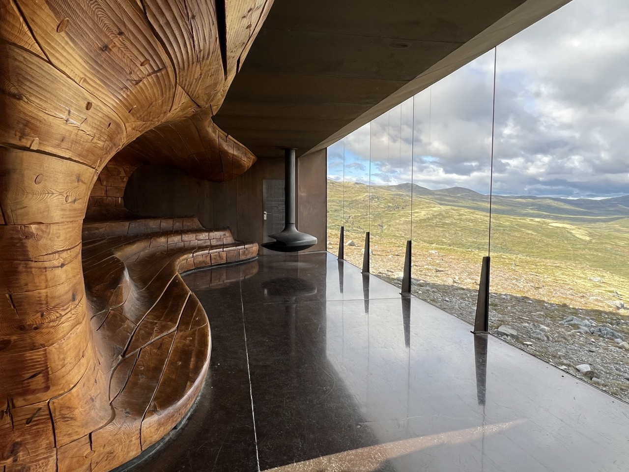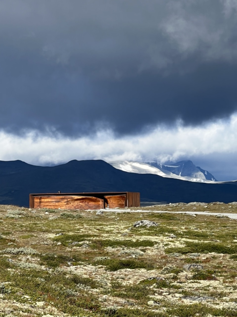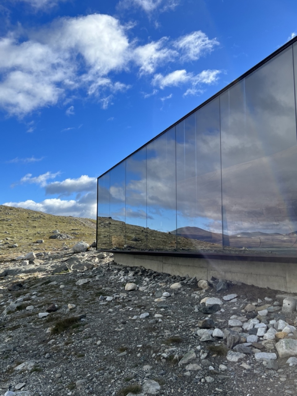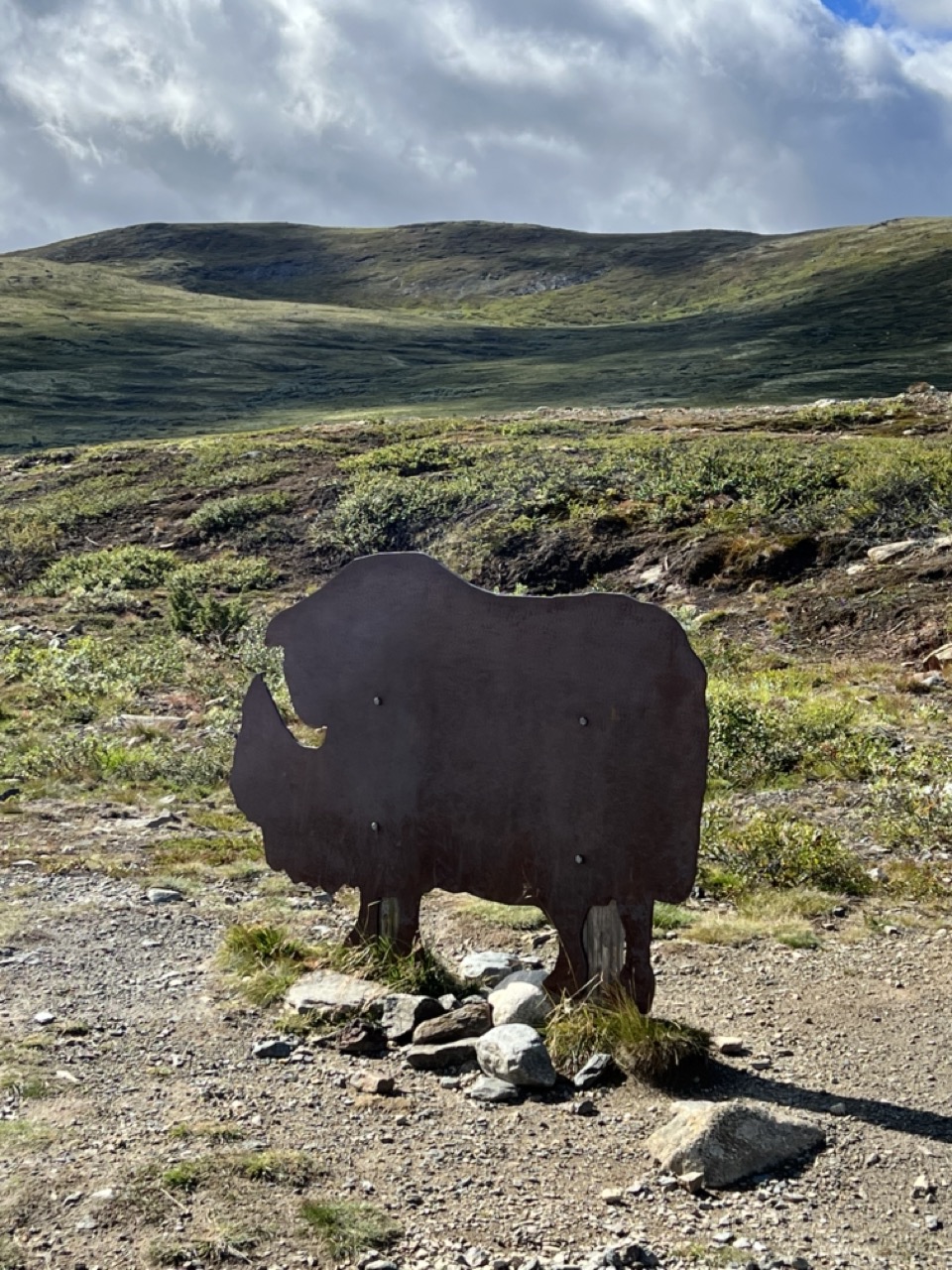 Il y a 250 spécimens qui vivent sur ces terres protégées de 4366 km2. Il faut donc beaucoup de patience, un brin de chance et de bonnes chaussures ! Ils n’ont pas vraiment d’habitudes, ils se baladent tranquillement ça et là. Ma première tentative n’a pas été productive, je n’ai vu que un mouton un panneau ! et la superbe architecture du Snohetta Viewpoint (du nom de l’agence d’architectes à qui l’on doit également l’étonnant Opéra d’Oslo)
